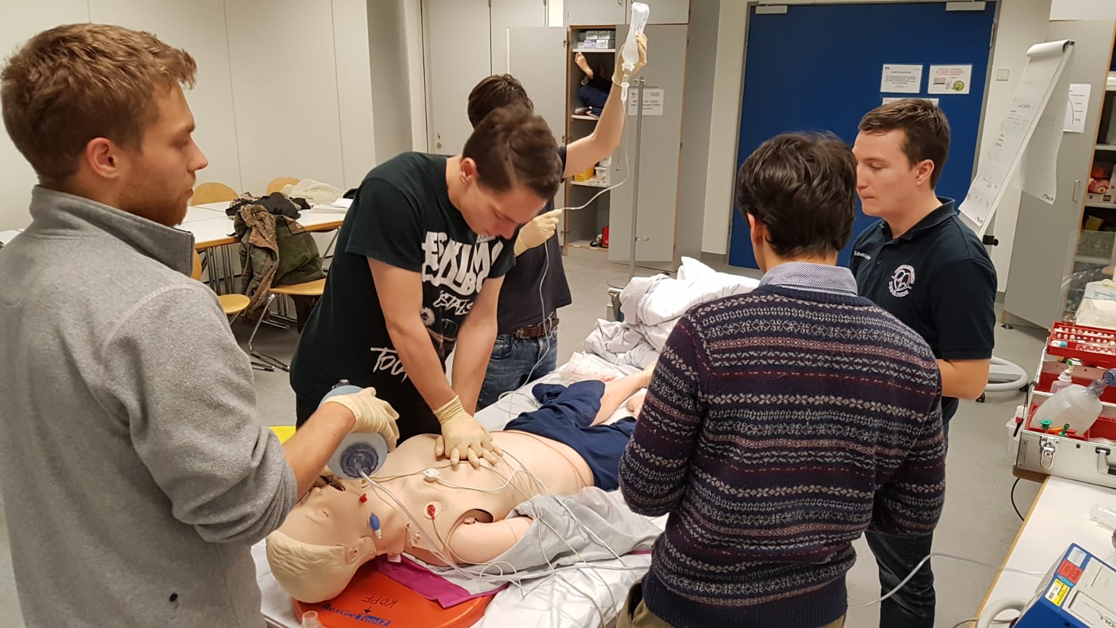 Natürlich darf neben der Theorie auch die Praxis nicht fehlen. Um die Skills und das erlernte Wissen praktisch anzuwenden haben wir von den Tutoren geleitete Szenariotranings vorbereitet. Hier kann an der Puppe die korrekte Atemwegssicherung, das Defibrillieren, das Legen von i.v. Zugängen, die Medikamentengabe und die EKG Diagnostik geübt werden.